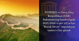 YUNESKO isleri boyınsha Ózbekstan Respublikası Milliy komissiyasınıń 2026-jıl 12-yanvardaǵı 359-6/25-sanlı xatına muwapıq YUNESKO hám Qıtay Xalıq Respublikası (QXR) Húkimetiniń 2026/2027-oqıw jılı ushın "Ullı Diywal" stipendiyasına tańlaw járiyalanǵan. Bul stipendiyalar baǵdarlaması sheńberinde QXR joqarı bilimlendiriw mákemelerinde izertlewshi (45 jas), jetekshi izertlewshiler (50 jas) ushın bir jıllıq qánigeligin arttırıw kursları,magistratura (35 jas) hám doktorantura (40 jas) ushın bir jıllıq oqıw kursları shólkemlestiriledi.