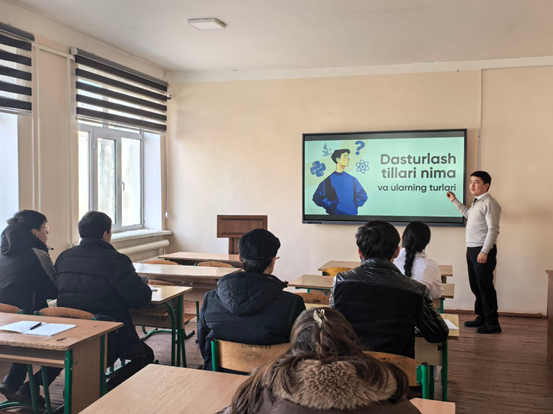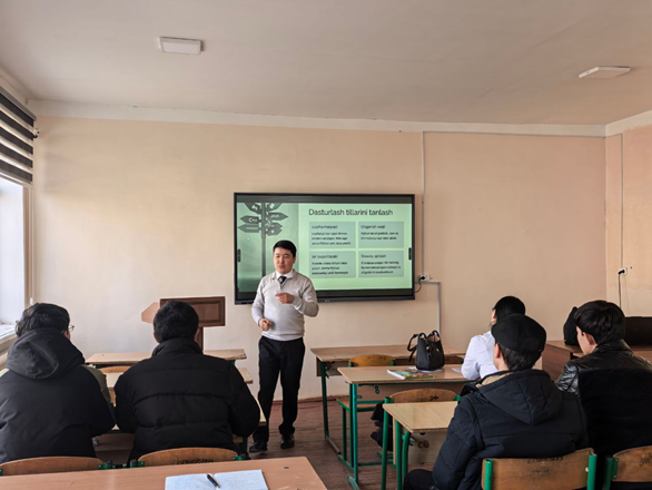 Dógerekti “Ekonomika hám gumanitar pánler” kafedrası oqıtıwshısı R. Abdullaev alıp bardı. Dógerek barısında qatnasıwshılarǵa búgingi kúndegi eń joqarǵı talapqa iye zamanagóy IT tarawı, sonıń ishinde Python, C++, Java, jаvascript sıyaqlı keń tarqalǵan programmalastıw tilleri hám olardıń keń imkanyatları, olardıń qollanılıw tarawları haqqında keńirek maǵlıwmat berildi.