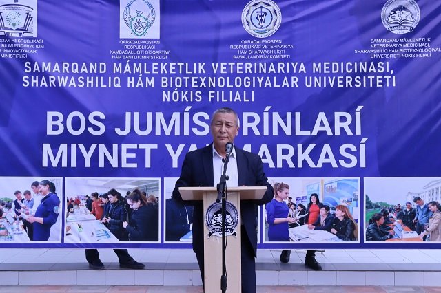 Búgin Samarqand mámleketlik veterinariya medicinası, sharwashılıq hám biotexnologiyalar universiteti Nókis filialında pitkeriwshi kurs studentleriniń bántligin támiyinlew hám jumıs beriwshiler menen miynet shártnamasın imzalaw maqsetinde bos jumıs orınları miynet yarmarkası bolıp ótti. Qaraqalpaqstan Respublikası Kámbaǵallıqtı qısqartıw hám bántlik ministrligi hám Qaraqalpaqstan Respublikası Veterinariya hám sharўashılıqtı rauajlandırıw komiteti menen birgelikte shólkemlestirilgen usı ilajda Qaraqalpaqstan Respublikası «Sharўanásil» orayınıń direktorı Q.Pirnazarov, Qaraqalpaqstan Respublikası «Qarakól» birlespesi baslıǵı A.Utemuratov, Qaraqalpaqstan Respublikası Kámbaǵallıqtı qısqartıw hám bántlik ministrligi bólim baslıǵı G.Daryabaeva, Qaraqalpaqstan Respublikası Veterinariya hám sharўashılıqtı rauajlandırıw komiteti baslıǵınıń orınbasarı B.Qurbanbaev qatnastı.