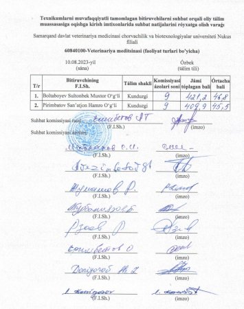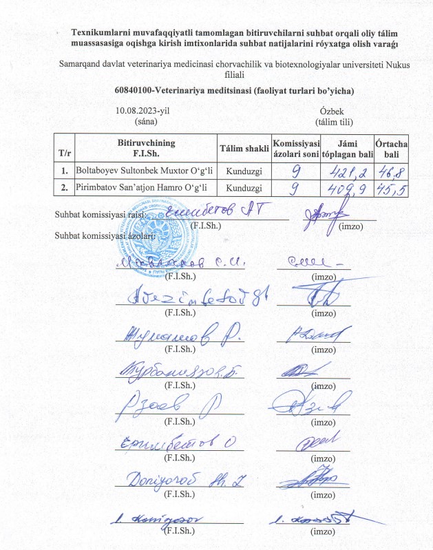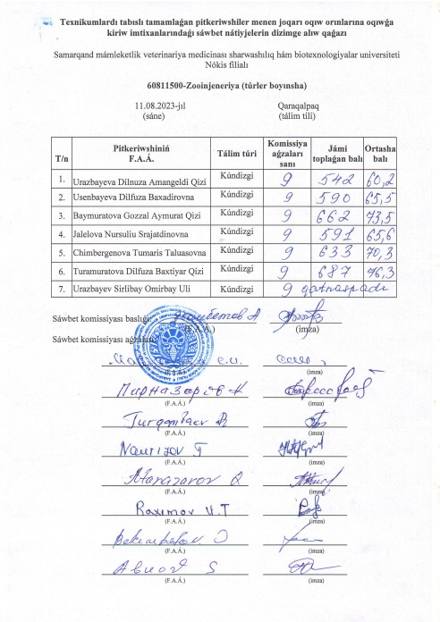 Texnikumlardı tabıslı tamamlaǵan jámi 21 abiturient arza tapsırǵan bólsa ótkerilgen sáwbet nátijelerine kóre 67 ball hám onnan joqarı ball toplaǵan 10 abiturient 2-kurstan baslap oqıwǵa qabıllandı.