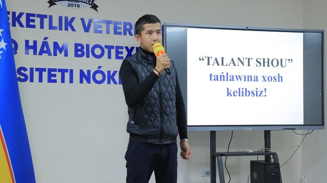 Filial student-jasları arasında qábiletli jaslardı tańlap alıw ushın «Talant shou» tańlawı ótkerildi. Jaslar menen islesiw, ruwxıylıq hám aǵartıwshılıq bólimi baslıǵı A.Seytkamalov ilájdı kiris sózi menen ashıp berip, student-jaslar arasınan ayrıqsha qábilet iyelerin anıqlaw ushın ótkerilip atırǵan tańlawdıń áhmiyetine toqtaldı.