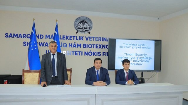 Usı jıldıń 1-dekabr kúni Samarqand mámleketlik veterinariya medicinası, sharwashılıq hám biotexnologiyalar universiteti Nókis filialınıń májilisler zalında «Jawızlıqqa qarsı aǵartıwshılıq» úgit-násiyat ilájı bolıp ótti. Onda Ózbekstan Respublikası Ministrler Kabineti janındaǵı Imam Buxariy xalıqaralıq ilimiy-izertlew orayınıń úlken ilimiy xızmetkeri J.Jumayev, usı oraydıń xızmetkeri C.Abduvoitov, professor-oqıtıwshılar hám student-jaslar qatnastı. Ilájdı oqıw isleri boyınsha direktor orınbasarı Q.Atanazarov ashıp berdi. Iláj dawamında sózge shıqqanlar, búgin jaslardı milliy hám diniy qádiriyatlardı qádirlewge úgit-násiyatlaw, olar arasında ruwxıy-aǵartıwshılıqtı keń en jaydırıw hám onıń nátiyjeliligin arttırıw, diniy jawızlıq hám hár túrli jaman illetlerge qarsı gúresiw úlken áhmiyetke iye ekenligin atap ótti.