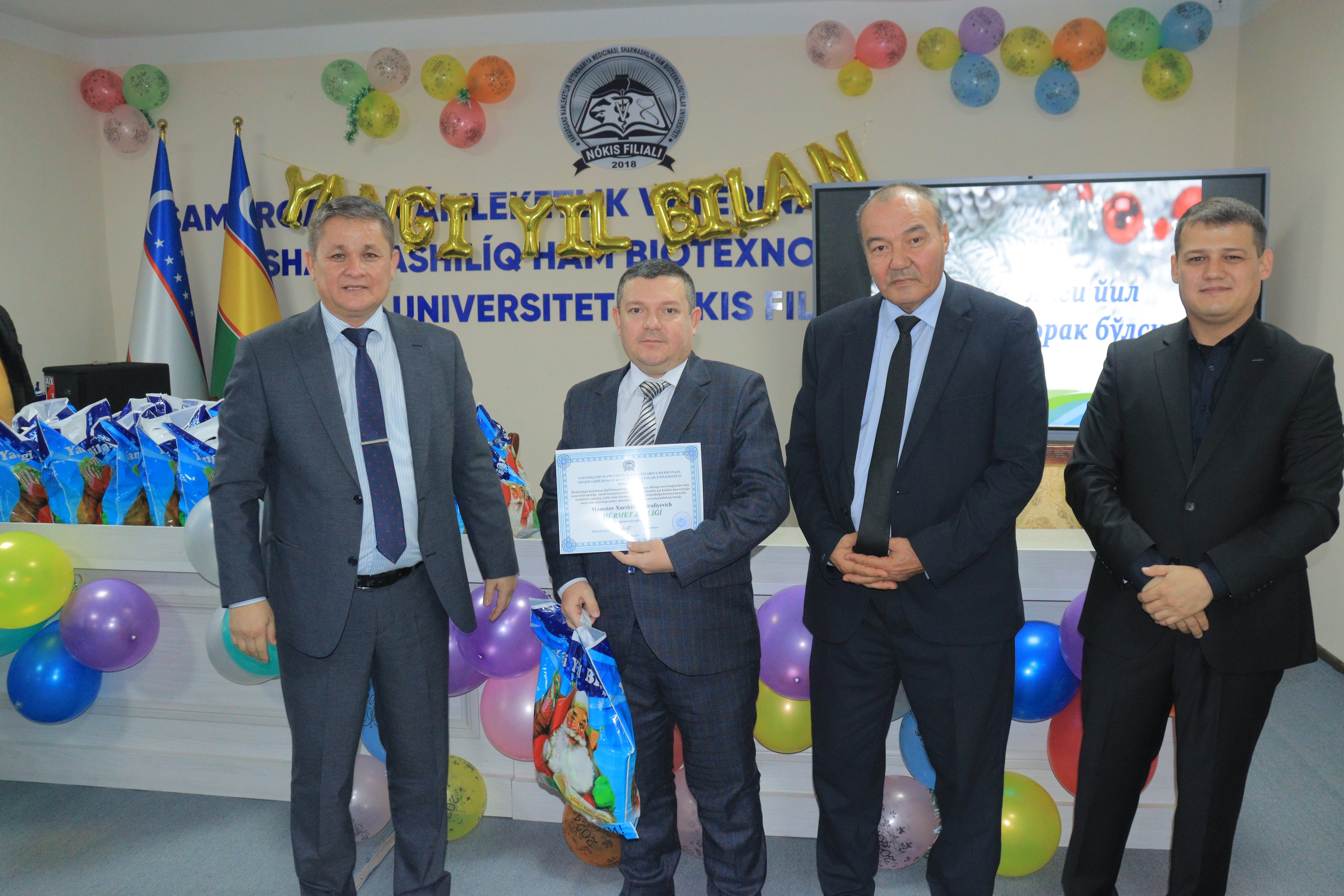 Ájayıbatlar bayramı bolǵan jańa jıl qarsańında hámme jaqın-juwıqlarına bayram sawǵaların bólisip, jıllı tileklerin bildiredi. Samarqand mámleketlik veterinariya medicinası, sharwashılıq hám biotexnologiyalar universiteti Nókis filialında hár jılı jańa jıl bayramı qarsańında professor-oqıtıwshılar hám xızmetkerlerge bayram sawǵaların inám etiw dástúrge aynlanǵan. Usı dástúrge sadıq qalǵan halda búgin pútkil filial jámááti bir jerge toplandı. Bayram ilájı basında filial direktorı Adilbay Esimbetov shıǵıp sóylep, jıynalǵanlardı kirip kiyatırǵan jańa jıl menen qutlıqlap, eń iygilikli tileklerin bildirip ótti.
