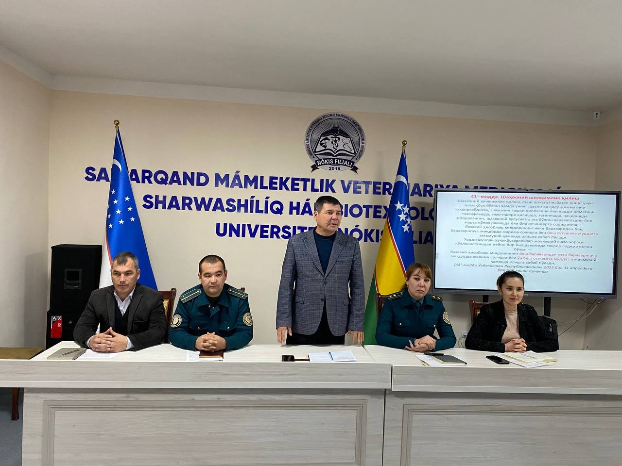 Samarqand mámleketlik veterinariya medicinası, sharwashılıq hám biotexnologiyalar universiteti Nókis filialında "Profilaktika kúni" sheńberinde student-jaslarǵa hár qanday huqıqbuzarlıqlar hám jınayatlardıń aldın alıw,korrupciyaǵa qarsı gúresiw boyınsha keń túsinikler beriw maqsetinde úgit-násiyat ilájı ótkerildi.