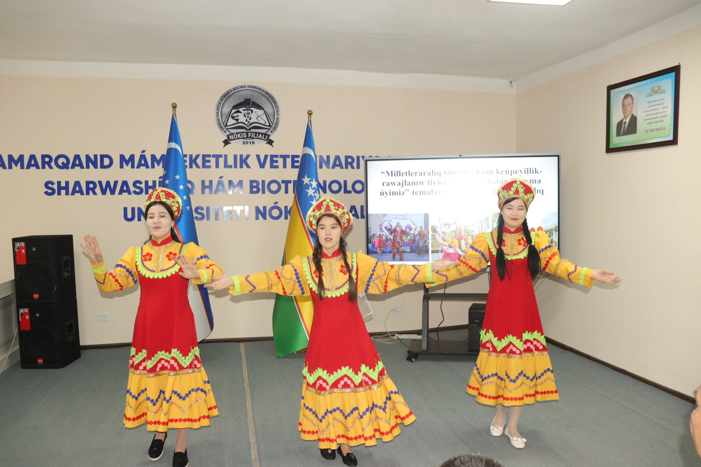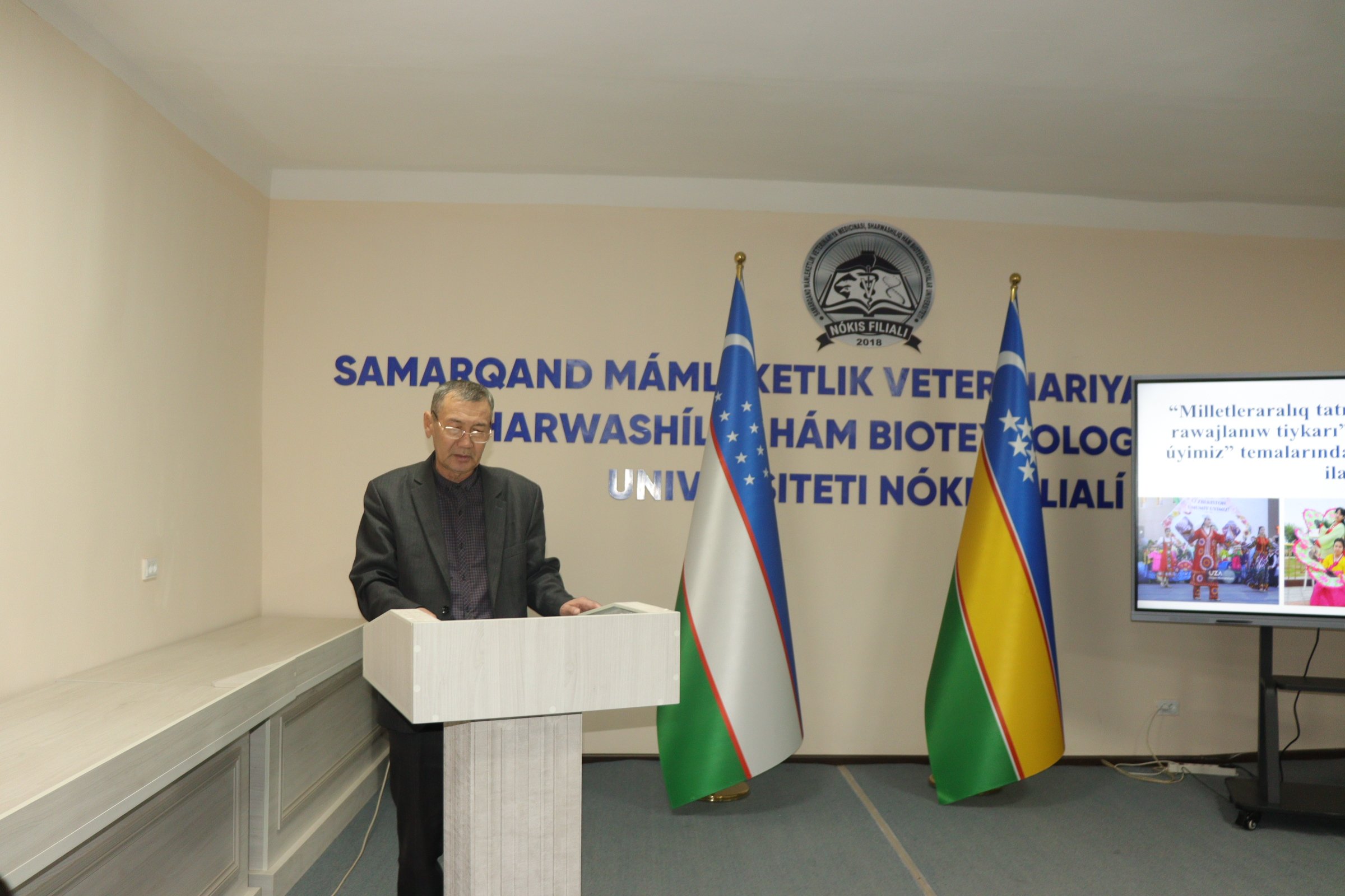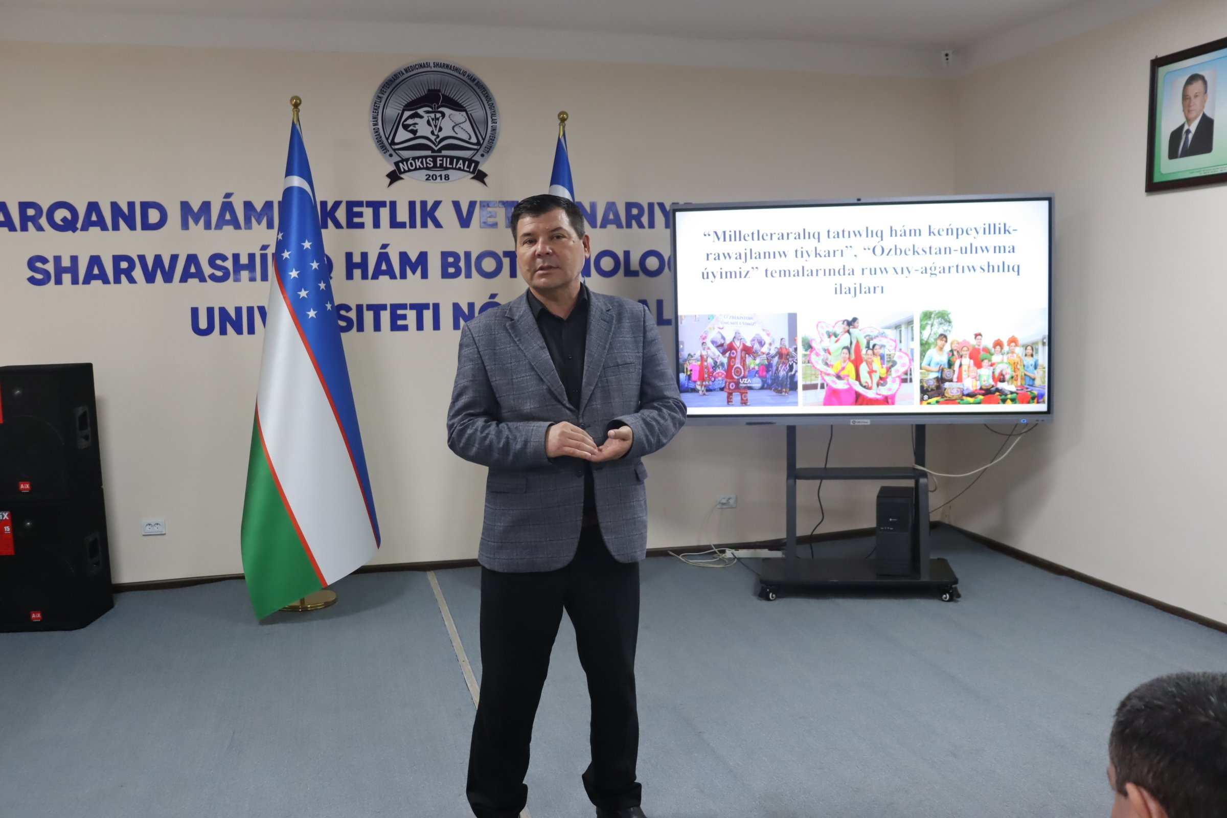 Búgin Samarqand mámleketlik veterinariya medicinası, sharwashılıq hám biotexnologiyalar universiteti Nókis filialında «Ózbekstan – ulıwma úyimiz» atamasında ruwxıy-aǵartıwshılıq ilájı ótkerildi. Iláj basında milliy qol-óneri úlgileri kórgizbesi shólkemlestirilip, kelgen miymanlar tamashaladı. Usı ilájda Din isleri boyınsha komitettiń Qaraqalpaqstan Respublikası aymaqlıq basqarmasınıń bas qánigesi X.Nezamatov,«Nuranıy» qorınıń baslıǵı K.Qalenderov, nuranıy ustaz B.Sultanov,«Paytaxt» gazetasınıń bas redaktorı X.Berdibayev, Respublikalıq Ruwxıylıq hám aǵartıwshılıq orayı, Nókis qalalıq bólimi baslıǵı Q.Nuratdinovlar sózge shıǵıp, búgingi kúnde Prezidentimizdiń baslaması menen ámelge asırılıp atırǵan iygilikli háreketler nátiyjesinde elimizde130 dan artıq millet wákilleri, sonday-aq 16 diniykonfessiya wákilleri awızbirshilikte jasap kiyatırǵanlıǵı, túrli millettiń ózine tán úrp-ádetleri hám milliy dástúrlerin húrmet qılıw hám rawajlanıdırıwǵa baǵdarlanǵan is-háreketler hám olardıń unamlı nátiyjeleri haqqında aytıp ótti.
