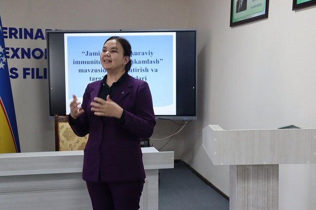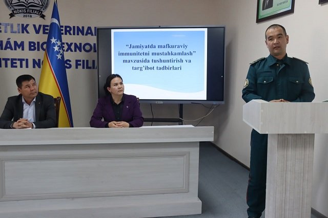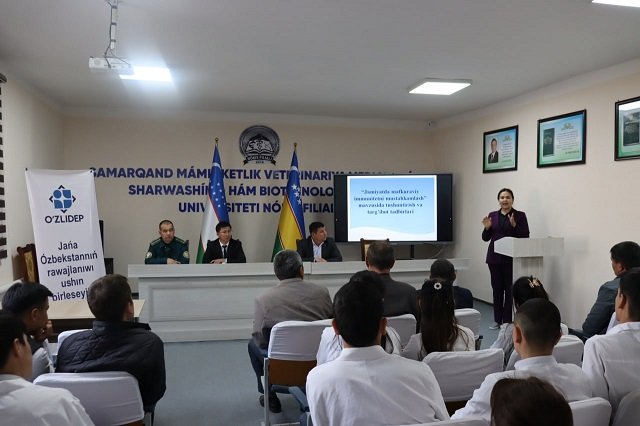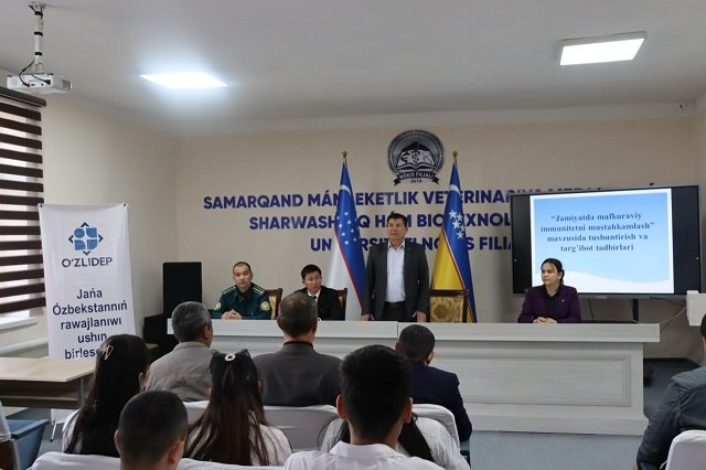 Búgin Samarqand mámleketlik veterinariya medicinası, sharwashılıq hám biotexnologiyalar universiteti Nókis filialınıń májilisler zalında "Jámiyette ideologiyalıq immunitetti bekkemlew" temasında ushırasıw bolıp ótti. Bul ilájda Ózbekstan Liberal – demokratiyalıq partiyası Qaraqalpaqstan Respublikalıq Keńesi Jaslar qanatı bólimi baslıǵı K.Xudaybergenova, Jaslar menen islesiw, ruwxıylıq hám aǵartıwshılıq bólimi baslıǵı A.Seytkamalov, «Veterinariya hám zooinjeneriya» fakulteti dekanı A.Kaniyazov, profilaktika inspektorı Q.Qayıpnazarovlar sózge shıǵıp, hár qanday xalıq hám milletiń birliginde milliy ideya áhmiyetli orın tutıwı, atap aytqanda, rawajlanıw jolında baratırǵan mámleketimizde de áyne usı másele úlken áhmiyetke iye ekenligi, buzǵınshı ideologiya hám ideyalarǵa qarsı unamlı ideyalar tiykarında gúres alıp barıwdı úgit-násiyatlaw áhmiyetli másele ekenligi haqqında toqtaldı.