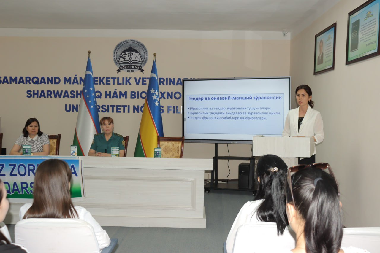 Samarqand mámleketlik veterinariya medicinası, sharwashılıq hám biotexnologiyalar universiteti Nókis filialınıń student-qızları hám texnikum oqıwshıları qatnasıwında «Hayal-qızlardıń sociallıq-siyasıy belsendiligin arttırıw, gender teńlik máseleleri hám gender zorlıq penen gúresiw» temasında sáwbetlesiw shólkemlestirildi.