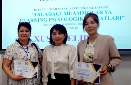 Ferǵana mámleketlik universitetinde ótkerilgen usı seminarda 100 den aslam psixologlar qatnastı. Seminar dawamında qatnasıwshılarǵa jańa jantasıwlar tiykarında jańa bilim hám kónlikpeler berildi. Qızıqlı tárizde alıp barılǵan usı seminarda Samarqand mámleketlik veterinariya medicinası, sharwashılıq hám biotexnologiyalar universiteti Nókis filialınıń psixologı Mexriban Allamuratova da qatnasıp qayttı.