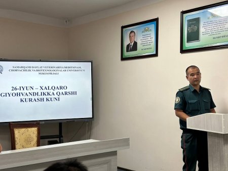 Samarqand mámleketlik veterinariya medicinası, sharwashılıq hám biotexnologiyalar universiteti Nókis filialınıń májilisler zalında 26-iyun-«Xalıqaralıq náshebentlikke qarsı gúresiw kúni» múnásibeti menen úgit-násiyat ilájı ótkerildi. Usı ilájda Nókis qalalıq ishki isler organları jumısların muwapıqlastırıw basqarması, jınayat qıdırıw bólimi operativ wákili, mayor S.Allamjarov, «Veterinariya hám zooinjeneriya» fakulteti dekanı A.Kaniyazov, filial profilaktika inspektorı aǵa leytenant Q.Qayıpnazarov hám student-jaslar qatnastı.