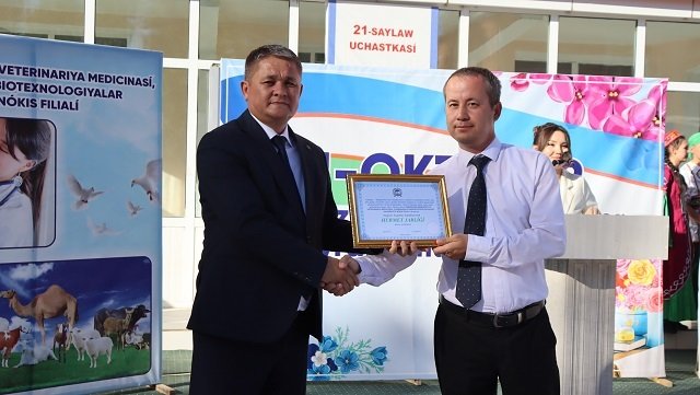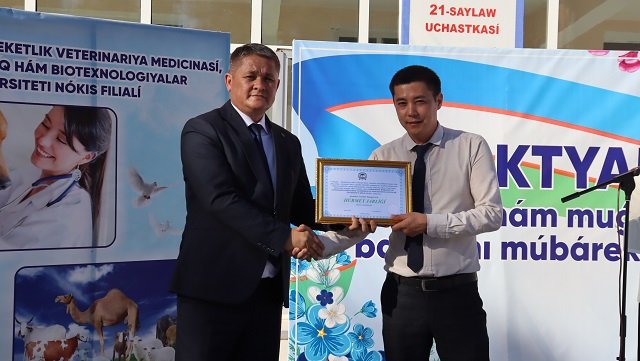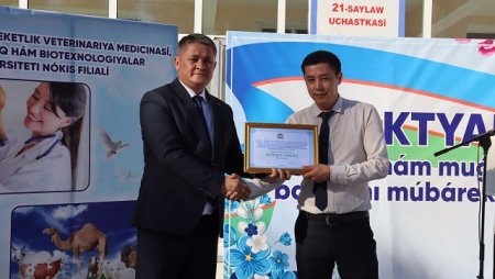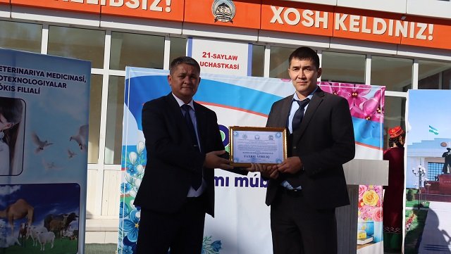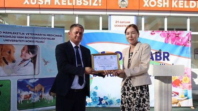 Samarqand mámleketlik veterinariya medicinası, sharwashılıq hám biotexnologiyalar universiteti Nókis filialında1-oktyabr – «Muǵallimler hám ustazlar kúni» múnásibeti menen bayram ilájı shólkemlestirildi. Qaraqalpaqstan Respublikası veterinariya hám sharўashılıqtı rawajlanıdırıw komiteti baslıǵınıń orınbasarı Q.Pirnazarov, filial basshılları, professor-oqıtıwshıları hámde student-jasları qatnasqan usı iláj basında Ózbekstan hám Qaraqalpaqstan Respublikalarınıń mámleketlik gimnlerijańladı. Filial direktorı, professor A.Esimbetov iláj basında sózge shıǵıp, oqıtıwshılıq dańqlı kásip ekenligin hámmemiz júdá jaqsı biliwimiz, bul dańqlı kásip iyelerin qansha húrmetlesek, sonshama az túyiliwi, olardıń jelkesinde keleshegimiz iyeleri bolǵan jas áwladtı tárbiyalaw sıyaqlı áhmiyetli bir wazıypa turǵanın ayrıqsha atap ótti. Iláj dawamında sózge shıqqanlar, keyingi jıllarda mámleketimizde oqıtıwshılardıń nátiyjeli miynetleri múnásip bahalanıp, olardıń abıroyın jáne de asırıw boyınsha alıp bapılıp atırǵan iygilikli jumıslar haqqında toqtaldı. Húrmetli Prezidentimizdiń óz shıǵıp sóylewleriniń birinde «Muǵallimniń abıroy-itibarı bolsa bul millettiń, pútkil xalıqtıń abıroy-itibarı-dep atap ótken edi. Haqıyqatında da hár birimizdiń óz kásibimizdiń jetik qánigesi bolıp, jámiyette óz ornın tabıwımızda olardıń xızmeti ullı. Insan qanday mártebe hám dárejege erispesin, ol álbette mektepte ápiwayı muǵallimnen bilim alǵan boladı. Ilajdıń kulminaciyalıq noqatında bolsa filialdajemisli miynet etip atırǵan bir qatar professor-oqıtıwshılar Ózbekstan Respublikası Aўıl xojalıǵı ministrligi tárepinen minnetdarshılıq hámde filial basshılları tárepinen húrmet jarlıǵı hám sawǵalar menen sıylıqlandı. Sonıt menen birge, sáne múnásibeti menen filial kásiplik awqamı tárepinen professor-oqıtıwshılar hám xızmetkerler ortasında ótkerilgen