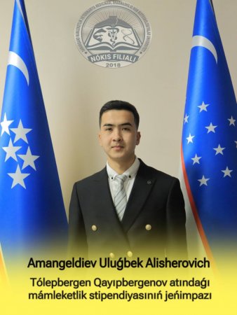 Ózbekstan Respublikası Joqarı bilimlendiriw, ilim hám innovaciyalar ministriniń 2024-jıl 11-dekabrdegi “2024/2025 oqıw jılı ushın respublika joqarı bilimleri shólkemleri bakalavriat basqıshı studentlerine Ózbekstan Respublikası Prezidenti hám ataqlı mámleketlik stipendiyaların tayınlaw haqqında”ǵı 464-sanlı buyrıǵına muwapıq, Zooinjeneriya (qarakólshilik) qánigeliginiń 3-kurs studenti Amangeldiev Uluǵbek Alisherovich Tólepbergen Qayıpbergenov atındaǵı mámleketlik stipendiyasınıń jeńimpazı bolıwǵa ılayıq dep tabıldı.