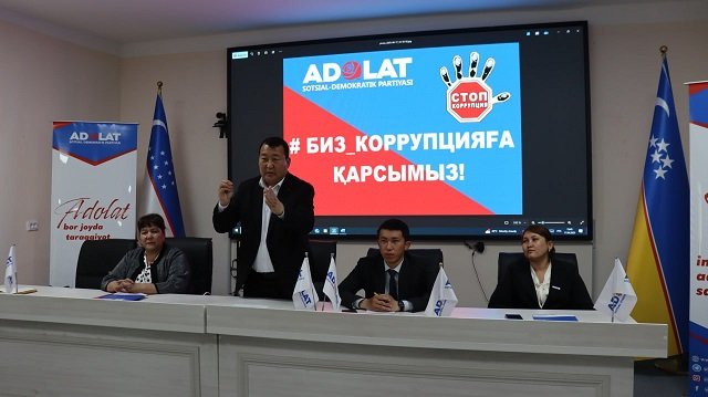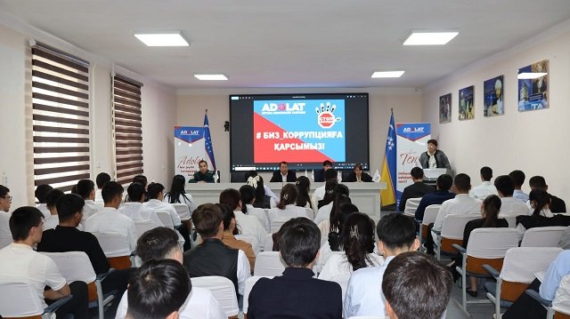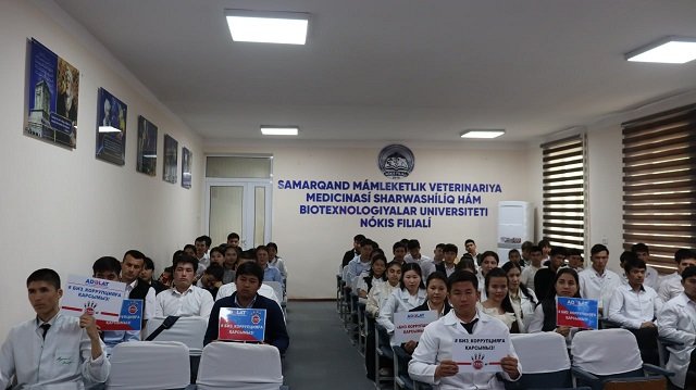Samarqand mámleketlik veterinariya medicinası, sharwashılıq hám biotexnologiyalar universiteti Nókis filialında jaslar arasında huqıqıy sananı hám mádeniyattı arttırıw, korrupciyaǵa qarsı gúresiw baǵdarında olardıń belsendiligin kúsheytiw maqsetinde "Biz korrupciyaǵa qarsımız" atamasında dógerek sáwbeti bolıp ótti. Onda Ózbekstan "Adolat" social-demokratiyalıq partiyasınıń Qaraqalpaqstan Respublikası Keńesi baslıǵınıń orınbasarı Sh.Toreshova, partiyanıń Nókis qalalıq Keńesiniń baslıǵı B.Masharipova, Qaraqalpaqstan Respublikası Ádillik ministrligi aymaqlıq basqarmasınıń wákili N.Berdiniyazova, filialdıń profilaktika inspektorı, kapitan Q.Qayıpnazarov, sonday-aq, korrupciyaǵa qarsı gúresiw "Komplaens qadaǵalaw" sistemasın basqarıw bóliminiń bas qánigesi T.Smaylov qatnastı.