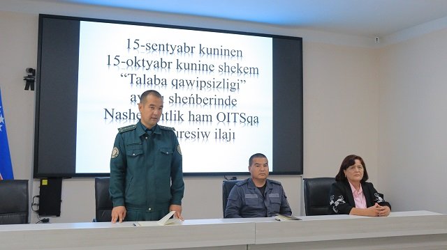 Ilajda Qaraqalpaqstan Respublikası Ishki isler ministrligi JQX, JTSBnıń xızmetkeri, kapitan I.Embergenov, Qaraqalpaqstan Respublikası AIJSna qarsı gúresiw orayınıń shıpaker-metodisti A.Janibekova, filial profilaktika inspektorı, kapitan Q.Qayıpnazarov hám filial studentleri qatnastı.