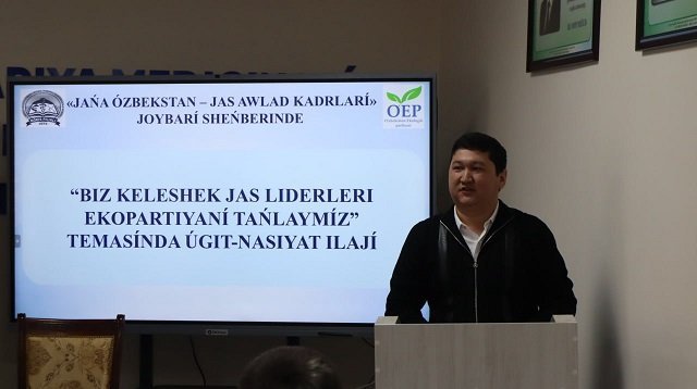 На мероприятии на тему «Мы, молодые лидеры, выбираем Экопартию», организованном в рамках проекта «Кадры нового поколения», выступили директор филиала А.Есимбетов, председатель исполкома Совета партийной организации Республики Каракалпакстан Экологической партии Узбекистана А.Бегимова, заместитель председателя Комитета Сената Олий Мажлиса Республики Узбекистан по вопросам развития региона Приаралья и экологии Б.Матмуратов, член Молодежного парламента при Законодательной палате Республики Узбекистан Б.Жиенбаев, которые говорили о проводимой работе по разрешению экологических проблем и предупреждению их последствий в виде ущерба окружающей среде и загрязнения воздуха.