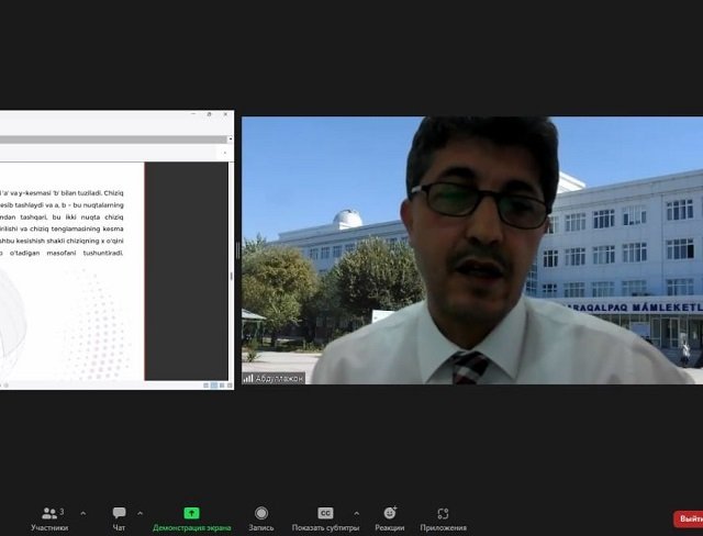 Аналитик геометрия элементлари мавзуси бўйича ўтказилган дарс давомида маърузачи Абдуллаҳ Курудирек батафсил тушунчаларни бериб ўтди. Талабалар онлайн маърузадан билим ва кўникмаларга эга бўлиши билан бирга, фойдали ва қўшимча маълумотларга эга бўлишди. Шунингдек, Абдуллаҳ Курудирек ҳамда Полат Хожалепесов ўзаро мулоқот олиб бориб, келгусида ҳамкорлик алоқаларини ўрнатиш, филиал талаба-ёшларига онлайн маърузаларни ташкил қилиб бориш каби масалаларни муҳокама қилишди.1-босқич 109-гуруҳ талабалари ушбу онлайн дарс мазмунли ва қизиқарли тарзда бўлиб ўтганлигиниалоҳида таъкидлаб ўтишди.