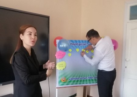 Филиал психологи Мехрибан Алламуратова томонидан Ёшлар билан ишлаш, маънавият ва маърифат бўлими бошлиғи А.Сейткамалов, Ахборот хизмати раҳбари З.Хожамуратова ҳамда 6 нафар тьютор иштирокида "Ҳаёт гўзал, умр бебаҳо” шиори остида психологик семинар-тренинг ўтказилди. Ёшлар масалалари бўйича ва маънавий-маърифий ишлар бўйича директорнинг биринчи ўринбосари С.Ганиев тадбирни очиб бериб, мана шундай тренингларни ташкил этиб бориш орқали филиал ходимларининг ҳаётга бўлган иштиёқини янада орттириш, тьюторларнинг талабалар билан иш олиб боришдаги натижалар самарадорлигини оширишда муҳим омил бўлишини таъкидлаб ўтди. М.Алламуратова иштирокчиларга семинар-тренинг йўналиши бўйича тушунчларни бериб, дастлаб уларнинг қайси темперамент турига киришини билиб олиш мақсадида тест ўтказилди ва натижалари шу ернинг ўзида эълон қилинди. Тренинг давомида иштирокчилар ўзини янада эркин ҳис қилишлари учун уларга ўзлари ёқтирган ном билан мурожаат қилинди. Қизиқарли психологик машқлар, ажойиб ўйинлар асосида ўтказилган тренинг барча иштирокчиларга позитив кайфият бағишлади. Медитация, тестлар ва машқлар қувноқлик билан амалга оширилди. Барча иштирокчилар сокинлик билан орзулар оламига саёҳат қилишди. Ажойиб тарзда ташкил этилган семинар якунида психолог М.Алламуратовага самимий ташаккурлар билдирилди ва келгусида ходимлар учун мана шундай тренингларди кўпроқ ташкил этиб бориш таклифи билдирилди. Шунингдек, ҳар бир иштирокчи яшаш учун 1001 сабаб акцияси доирасида плакатга стикерлер ёрдамида мотивацион жумлаларни ёзиб қолдиришди.