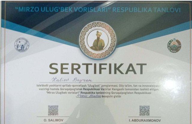 Shuningdek, tanlovning Qoraqalpog‘iston Respublikasi bosqichiga yo‘llanmani qo‘lga kiritdi. Talabamiz B.Kalievni ushbu ijobiy natijasi bilan samimiy qutlaymiz va keyingi bosqichlarda omad yor bo‘lishini tilab qolamiz!