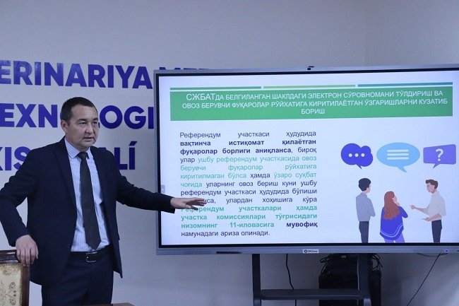 Bugun filialimizning majlislar zalida Yoshlar masalalari va ma'naviy-ma'rifiy ishlar bo‘yicha direktorning birinchi o‘rinbosari S.Ganiev boshchiligida "Referendum: Oʻzbekiston — ijtimoiy, huquqiy davlat" mavzusida uchrashuv o‘tkazildi. Unda Yangi tahrirdagi Konstitusiya porloq kelajagimiz uchun ulkan qadam bo‘lishi va katta maqsadlarimizni belgilab olishimiz uchun g‘oyat muhim ahamiyat kasb etishi ta'kidlandi. S.Ganiev tomonidan talaba-yoshlarga «referendum» tushunchasi va referendum o‘tkazish jarayoni bo‘yicha atroflicha ma'lumotlar berildi. Jumladan, fuqarolarning ushbu jarayonda ishtirok etish tartibi, referendum o‘tkazishdagi asosiy prinsiplar, ovoz berish qay tartibda amalga oshirilishi, referendum o‘tkazuvchi komissiyalar faoliyatining huquqiy asoslari, fuqarolarning mazkur jarayonlarda qanday huquqga ega ekanligi xususida batafsil tushunchalar berildi.