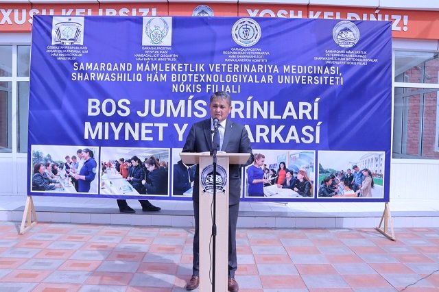 Bugun Samarqand davlat veterinariya meditsinasi, chorvachilik va biotexnologiyalar universiteti Nukus filialida bitiruvchi kurs talabalarining bandligini ta'minlash va ish beruvchilar bilan mehnat shartnomasi imzolash maqsadida bo‘sh ish o‘rinlari mehnat yarmarkasi bo‘lib o‘tdi. Qoraqalpog‘iston Respublikasi kambag‘allikni qisqartirish va bandlik vazirligi hamda Qoraqalpog‘iston Respublikasi Veterinariya va chorvachilikni rivojlantirish qo‘mitasi bilan hamkorlikda tashkil etilgan ushbu tadbirda Qoraqalpog‘iston Respublikasi “Chorvanasl” markazi direktori Q.Pirnazarov, Qoraqalpog‘iston Respublikasi “Qorako‘l” uyushmasi raisi A.Utemuratov, Qoraqalpog‘iston Respublikasi kambag‘allikni qisqartirish va bandlik vazirligi bo‘lim boshlig‘i G.Daryabaeva, Qoraqalpog‘iston Respublikasi Veterinariya va chorvachilikni rivojlantirish qo‘mitasi raisining o‘rinbosari B.Qurbaniyazov ishtirok etishdi. Filial direktori Adilbay Esimbetov va boshqalar so‘zga chiqib, bugungi kunda mamlakatimizda oliy o‘quv yurtlarida tahsil olayotgantalaba-yoshlarning bandligini ta'minlashga alohida e'tibor qaratilib, bu boradagi Davlatimiz Rahbari tomonidan belgilab berilgan ustuvor vazifalar ijrosi yuzasidan amalga oshirilayotgan ishlarga to‘xtaldi.