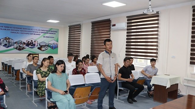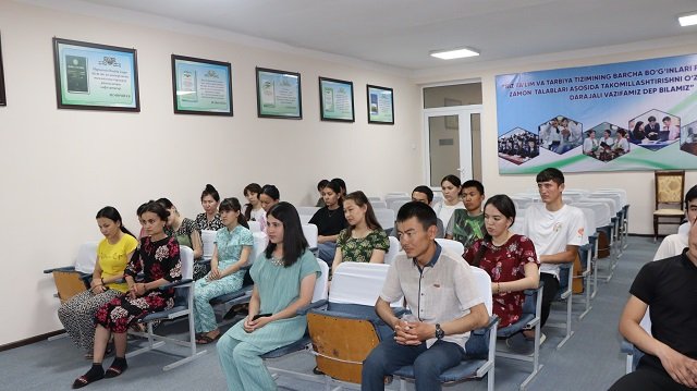 Yoshlar bilan ishlash, ma'naviyat va ma'rifat bo‘limi boshlig‘i A.Seytkamalov va tyutor A.Baymuratov ishtirokida o‘tkazilgan muloqot davomida yotoqxonadagi ichki tartib intizom, belgilangan qoidalarga amal qilish, darsdan bo‘sh vaqtlarini foydali va maqsadli tashkil etish masalalari haqida so‘z yuritildi.