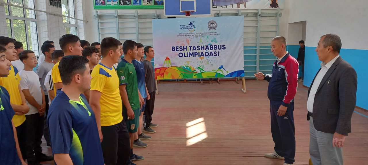 O’zbekiston Respublikasi Prezidentining 2022 yil 28-yanvardagi PF-60-sonli Farmoni bilan tasdiqlangan «2022-2026 yillarga mo’ljallangan Yangi O’zbekistonning taraqqiyot strategiyasi» 67-maqsadida belgilangan vazifalarni amalga oshirish, jismoniy tarbiya va sport bilan muntazam shug’ullanadigan talabalarning sonini oshirish, sport tadbirlariga keng turda jalb qilish maqsadida joriy yilning 21-sentyabr kuni Samarqand davlat veterinariya medisinasi, chorvachilik va biotexnologiyalar universiteti Nukus filiali talaba-yoshlari o’rtasida «Besh tashabbus olimpiadasi» doirasida filialda ishlab chiqilgan jadval asosida sportning mini-futbol, voleybol, stol tennis, yengil atletika va stritbol turlari bo’yicha sport musobaqalariga start berildi. Voleybolsport turi bo’yicha guruhlar o’rtasida o’tkazilgan sport musobaqalariga 180 dan ziyod talaba-yoshlarishtiroketib, qizg’in bahslar olib borildi. Musobaqa g’oliblari aniqlanib, kelgusi bosqichga yo’llama oldilar.