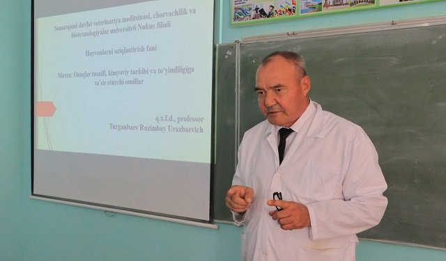 Samarqand davlat veterinariya meditsinasi, chorvachilik va biotexnologiyalar universiteti Nukus filiali ilmiy ishlar va innovatsiyalar bo‘yicha direktor o‘rinbosari, qishloq xo‘jaligi fanlari doktori, professor Turganbaev Ruzimbay Urazbaevich talabalarga ochiq ma'ruza o‘tdi. «Ozuqalar tasnifi, kimyoviy tarkibi va to‘yimliligiga ta'sir etuvchi omillar» mavzusida olib borilgan ma'ruza mashg‘uloti davomida talabalarga ozuqalarning turlari, uning kimyoviy tarkibi, mineral modda va vitaminlar, olinadigan oziqlarning qanday shaklda sinflarga bo‘linishi xususida to‘laqonli ma'lumotlar berildi.