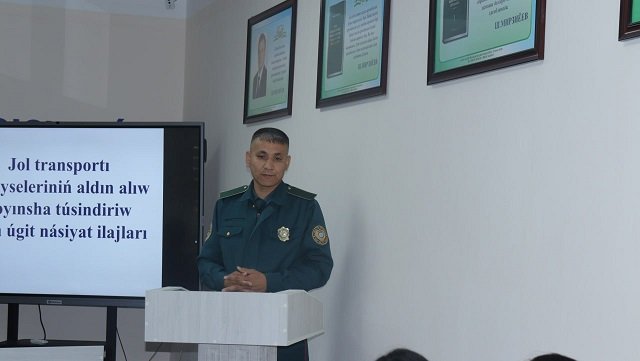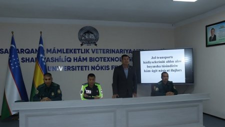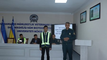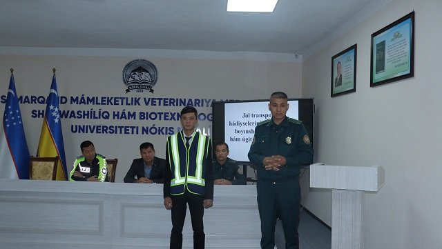 Qoraqalpog‘iston Respublikasi Ichki ishlar vazirligi Jamoat xavfsizligi xizmati, Yo‘l harakati xavfsizligi boshqarmasi inspektori, leytenant A.Eshniyazov va safdor T.Utemuratovlar Samarqand davlat veterinariya meditsinasi, chorvachilik va biotexnologiyalar universiteti Nukus filialiga kelib, talaba-yoshlarga yo‘l-transport hodisalari bo‘yicha targ‘ibot tadbirini olib bordi. Unda Yoshlar bilan ishlash, ma'naviyat va ma'rifat bo‘limi boshlig‘i A.Seytkamalov, profilaktika inspektori, katta leytenant Q.Qaypnazarov va talaba-yoshlar ishtirok etishdi. A.Seytkamalov kirish so‘zi bilan tadbirni ochib berdi.