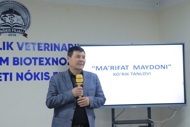 Samarqand davlat veterinariya meditsinasi, chorvachilik va biotexnologiyalar universiteti Nukus filiali talaba-yoshlari orasida “Ma'rifat maydoni” ko‘rik-tanlovi o‘tkazildi. Yoshlar bilan ishlash, ma'naviyat va ma'rifat bo‘limi boshlig‘i A.Seytkamalov tadbirni ochib berdi. Tanlovda 5 nafar tyutorning talaba-yoshlaridan tashkil topgan jamoalar jami 3 shart bo‘yicha bellashdilar. Jumladan, 1-shartda ishtirokchilar O‘zbekiston Qahramoni, O‘zbekiston va Qoraqalpog‘iston xalq yozuvchisi To‘lepbergen Qaipbergenov hamda O‘zbekiston xalq yozuvchisi O‘tkir Hoshimovning hayoti va ijodi hamda ushbu ulug‘ insonlarning ibratli umr yo‘llarini o‘z fikrlari bilan so‘zlab berdilar. 2-shart ya'ni, tezkor savol-javob shartida esa adiblar ijodi va hayotidan olingan savollarga qoniqarli tarzda javob berishdi. 3-shart juda qiziqarli tarzda bo‘lib o‘tdi. Bunda har bitta jamoaadiblarning asarlaridan sahnali ko‘rinishlarni ijro qilishdi. Tanlov davomida talaba-yoshlarning kitob mutolaasiga bo‘lgan mehri, kitob o‘qish orqali o‘zlashtirgan bilim va ko‘nikmalari, aktyorlik mahorati, sahna madaniyati namoyon bo‘ldi. Jamoalar har bir shart bo‘yicha hakamlar hay'ati tomonidan xolisona baholanib bordi. Hayojonli va zavqli onlarga boy tarzda kechgan tanlovning natijalari quyidagicha: 1-o‘rin —Tyutor J.Mambetniyazovning «Ziyolilar» jamoasi; 2-o‘rin — Tyutor B.Iskakovning «Mamanbiy avlodlari» jamoasi; 3-o‘rin — Tyutor E.Djumabaevaning «Kitobsevarlar» jamoasi. Tanlov g‘oliblari diplom va jng yaxshi sovg‘a—kitob bilan taqlirlandi.