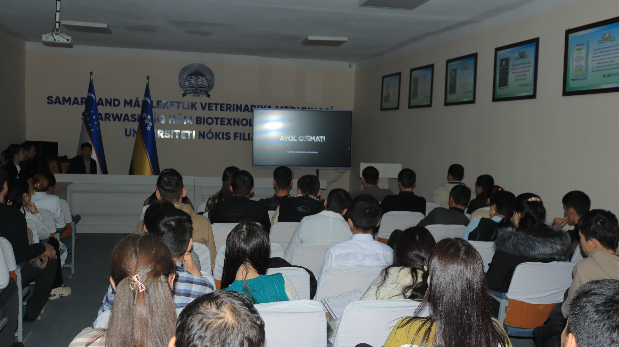 Jumladan, Samarqand davlat veterinariya meditsinasi, chorvachilik va biotexnologiyalar universiteti Nukus filiali o‘qituvchilari, xodimlari va talabalari ham ushbu film tomoshasiga qamrab olinmoqda. Bugun filialga O‘zbekiston Respublikasi Din ishlari bo‘yicha Qo‘mitaning Qoraqalpog‘iston Respublikasi hududiy boshqarmasining Nukus shahar bosh mutaxassisi X.Nezmatov, boshqarmaning Xotin-qizlar masalalari bo‘yicha yetakchi mutaxassisi X.Ibraymova, Qoraqalpog‘iston Respublikasi ichki ishlar vazirligi Terrorizmga qarshi kurashish boshqarmasi yetakchi mutaxassisi S.Tanabergenov tashrif buyurib, “Ayol qismati” filmining suratga olinishidan ko‘zlangan ezgu maqsadga alohida urg‘u berishdi. Tadbirni filial direktori A.Esimbetov kirish so‘zi bilan ochib berib, shu kabi keng ma'noga ega filmlar yoshlarimizga to‘g‘ri yo‘ldan borishlari uchun chin ma'noda ibrat bo‘la olishini ta'kidlab o‘tdi. Shundan so‘ng, yig‘ilganlarga “Gran Pri” mukofotiga sazovor bo‘lgan “Ayol qismati” filmi qo‘yib berildi.