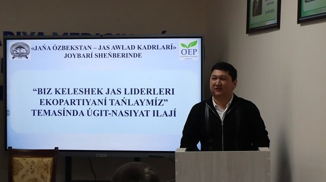 “Yangi avlod kadrlari” loyihasi doirasida «Biz kelajak yosh liderlari ekopartiyani tanlaymiz» mavzusida o‘tkazilgan ushbu tadbirda filial direktori A.Esimbetov, O‘zbekiston Ekologik partiyasi Qoraqalpog‘iston Respublikasi partiya tashkiloti kengashi Ijroiya qo‘mitasi raisi A.Begimova, O‘zbekiston Respublikasi Oliy Majlisi Senatining Orolbo‘yi mintaqasini rivojlantirish masalalari va ekologiya qo‘mitasi raisi o‘rinbosari B.Matmuratov, O‘zbekiston Respublikasi Oliy Majlisi Qonunchilik palatasi huzuridagi Yoshlar parlamenti a'zosi B.Jienbaevlar so‘zga chiqib, bugungi kunda ekologik muammolarni bartaraf etish va atrof-muhit buzilishi, havoning ifloslanishi kabi salbiy oqibatlarning oldini olish bo‘yicha amalga oshirilayotgan ishlar haqida to‘xtaldi. Tadbirda yoshlarga O‘zbekiston Ekologik partiyasining ko‘zlagan ezgu maqsadi hamda vazifalari nimalardan iborat ekanligi, partiyaning bugungi faoliyati haqida ma'lumotlar berildi. Tadbir ishtirokchilari ekologiya barqarorligini ta'minlash, aholi orasida sog‘lom turmush tarzini keng targ‘ib qilish, dunyodagi ekologik vaziyat bo‘yicha ularning xabardorligini oshirib borish muhim ekanligi bo‘yicha tushunchalarga ega bo‘lishdi.
