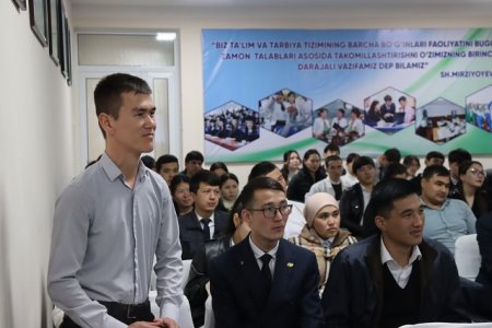 Ushbu uchrashuvda direktor iqtidorli, faol talabalar bilan uchrashib, ochiq muloqot olib bordi. Olib borilgan suhbat davomida talabalarni qiynayotgan turli muammolar, ular erishib kelayotgan yutuqlar, iqtidorli talabalarning turli tanlov va loyihalarda ishtiroki va o‘qish jarayoniga oid masalalar xususida so‘z yuritildi. —Har bir inson hayotda o‘z yo‘lini o‘zi tanlaydi. Yorug‘ kelajagini o‘ylagan yoshlar ilm-ma'rifat yo‘lidan boradi—deydi direktor Adilbay Esimbetov, —zero, yaxshi bilim va salohiyatga ega bo‘lish, faqat diplom uchun emas katta maqsadlar va porloq kelajak uchun ta'lim olish har bir yoshning hayotidagi muhim qadam sanaladi. Biz sizlarga faqat yo‘lboshchi vazifasini o‘tab beramiz, o‘z o‘rningizga va katta yutuqlarga esa o‘z intilishlaringiz, halol mehnatingiz va albatta egallagan chuqur bilimlaringiz evaziga erishasiz.