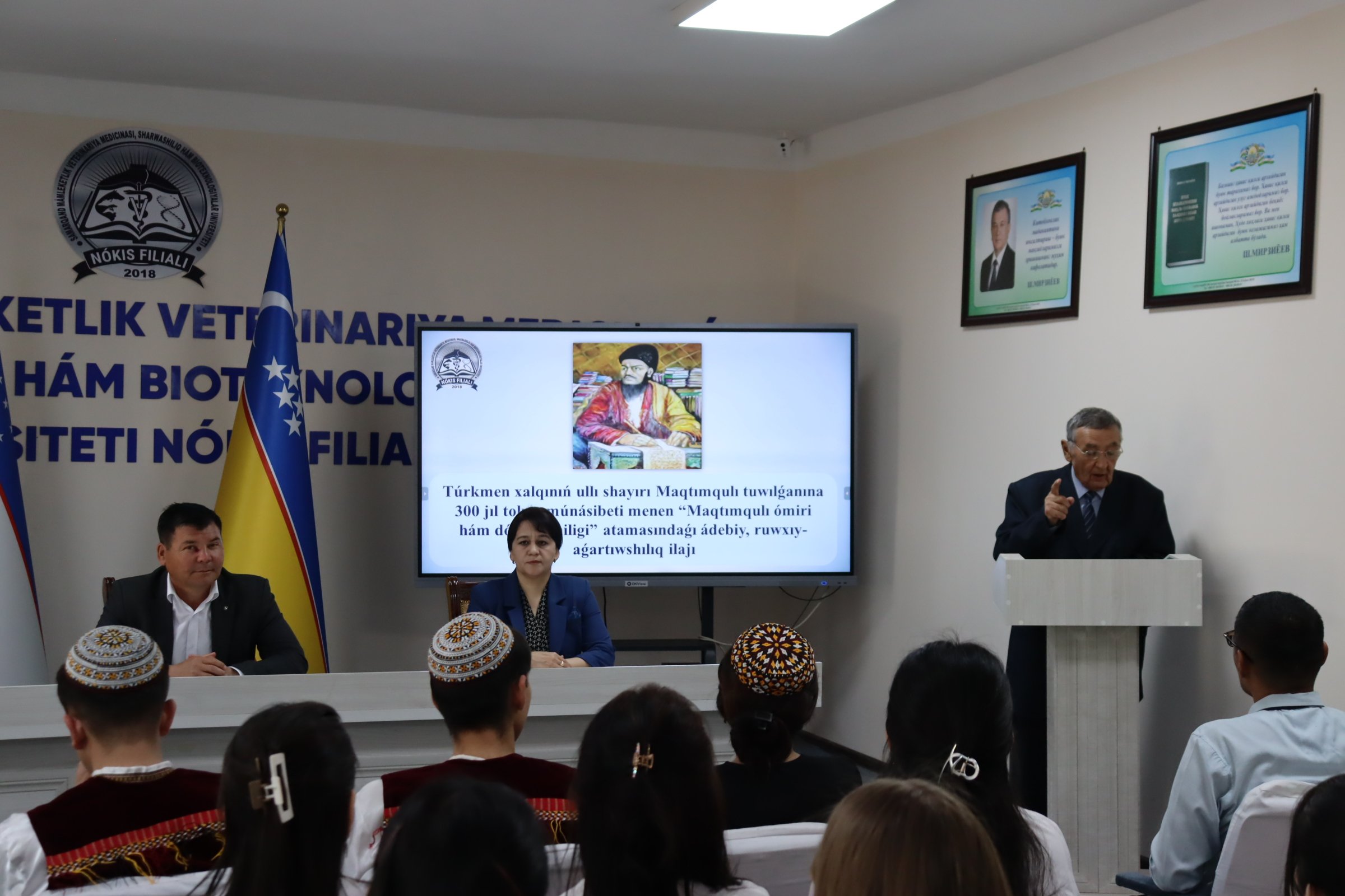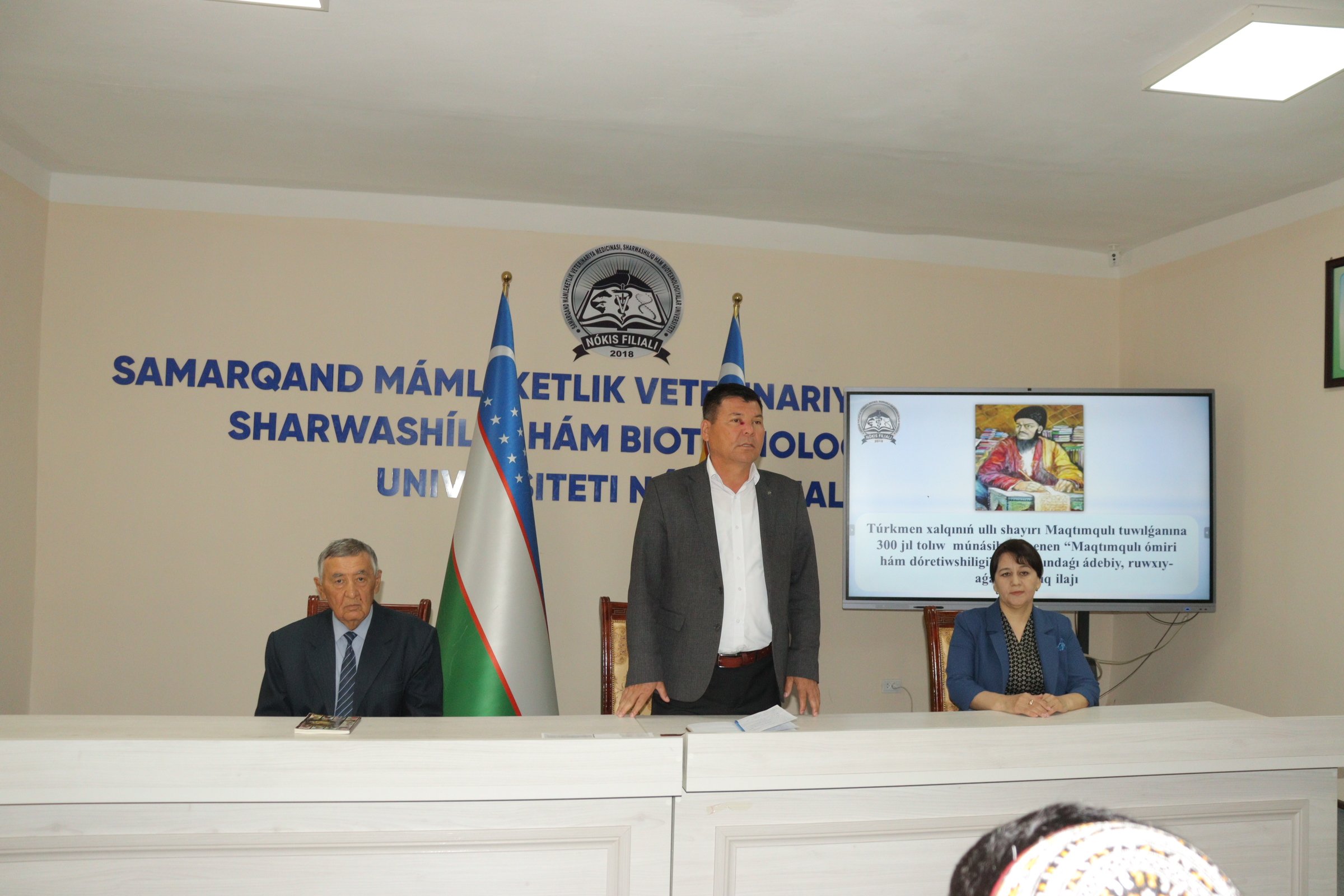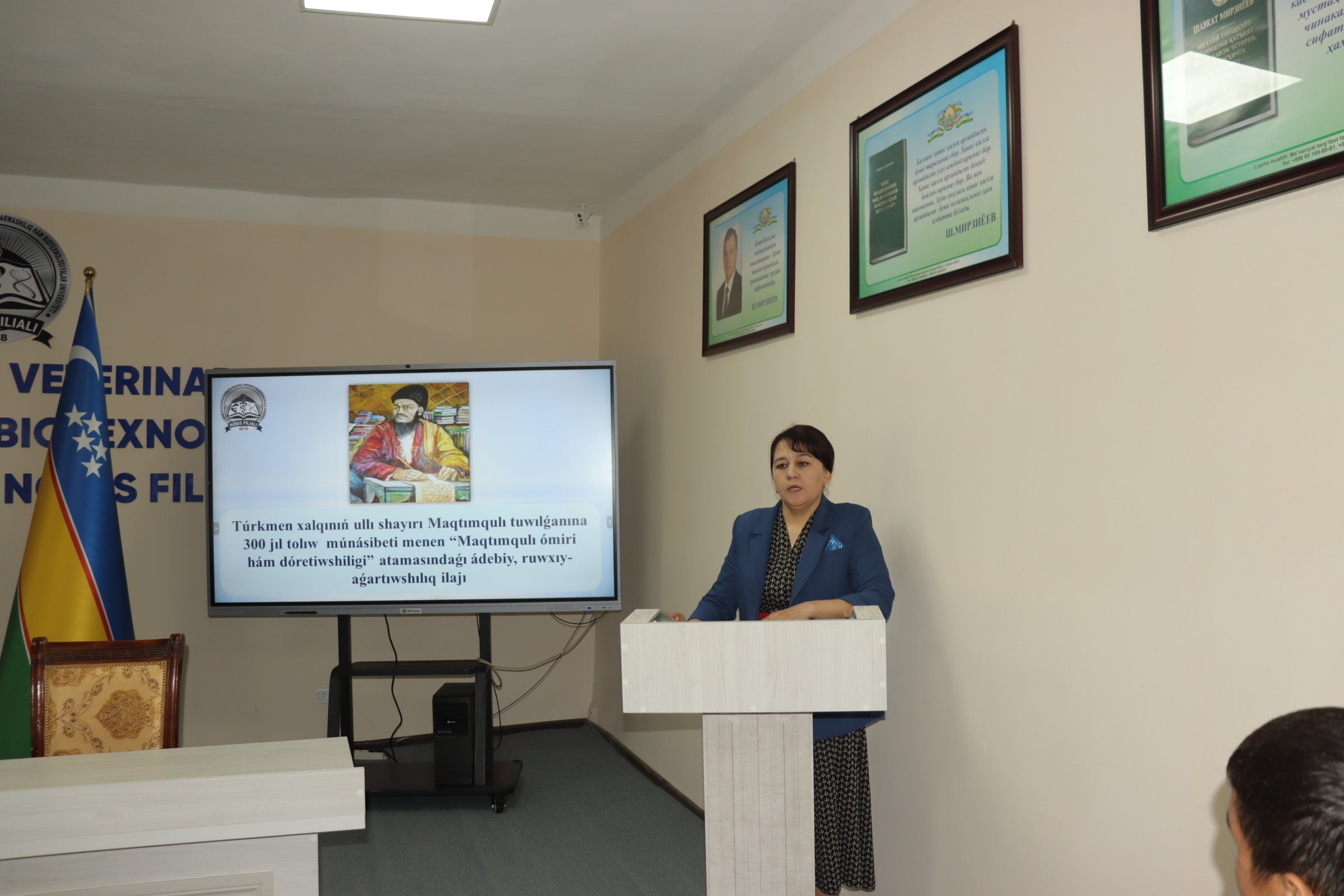 Ma'lumki joriy yilda mamlakatimizda buyuk turkman shoiri Maxtumquli Firog‘iy tavalludining 300 yilligini keng nishonlash belgilangan. Joylarda shu munosabat bilan turli ma'naviy va ma'rifiy tadbirlar tashkil etib kelinmoqda. Bugun, ya'ni 19 aprel kuni Samarqand davlat veterinariya meditsinasi, chorvachilik va biotexnologiyalar universiteti Nukus filialida «Atoqli Turkman xalqining farzandi Maxtumquli hayoti va ijodi» mavzusida ma'naviy-ma'rifiy kecha tashkil etildi.