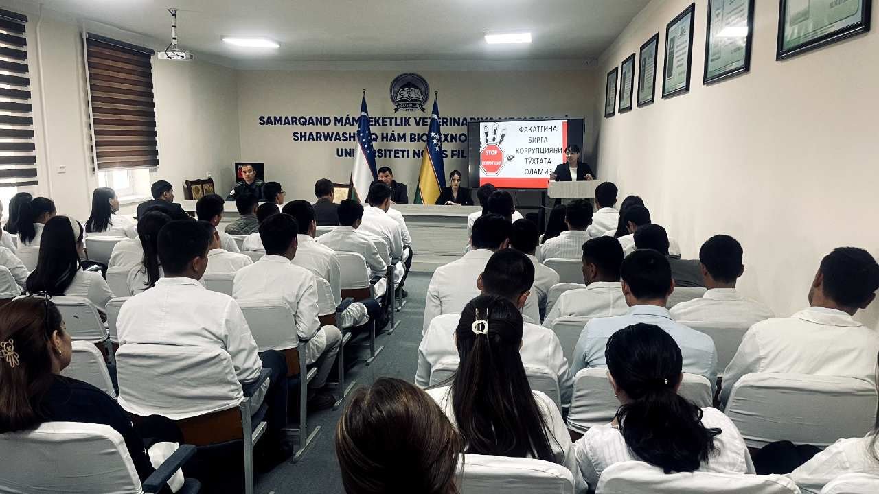 Samarqand davlat veterinariya meditsinasi, chorvachilik va biotexnologiyalar universiteti Nukus filialida «Faqatgina birga korrupsiyani to‘xtata olamiz» mavzusida targ‘ibot tadbiri o‘tkazildi. Ushbu tadbirda Qoraqalpog‘iston Respublikasi Adliya vazirligining Huquqiy axborot bo‘yicha bosh mutaxassisi N.Berdiniyazova, profilaktika inspektori Q.Qayipnazarov, Korrupsiyaga qarshi kurashish “komplaens nazorat” tizimini boshqarish bo‘limi bosh mutaxassisi T.Smaylov, yuriskonsult N.Qannazarova, o‘qituvchilar va talaba-yoshlar ishtirok etishdi.