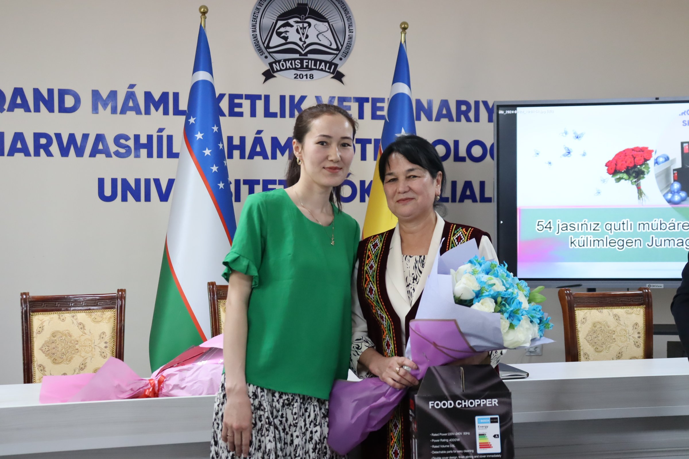 Bugun Samarqand davlat veterinariya meditsinasi, chorvachilik va biotexnologiyalar universiteti Nukus filialida «Hayvonlar anatomiyasi, fiziologiyasi va biokimyosi» kafedrasining assistent-o‘qituvchisi, sobiq Axborot resurs markazi bo‘limi boshlig‘i Xalmuratova Jumagul Mafurovaning tavvalud ayyommi munosabati bilan tabrik tadbiri tashkil etildi.