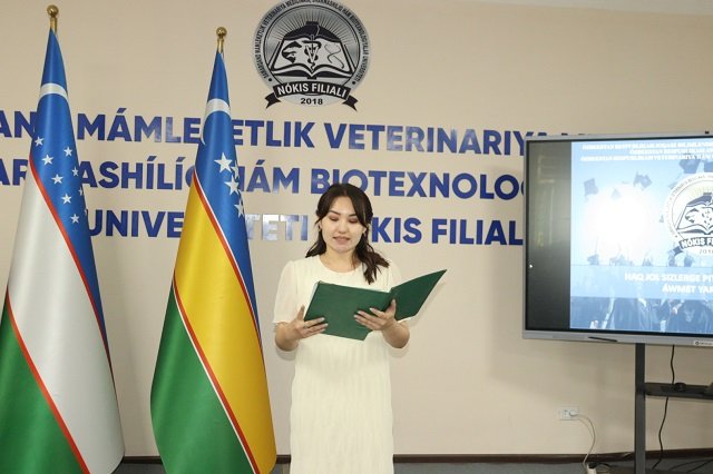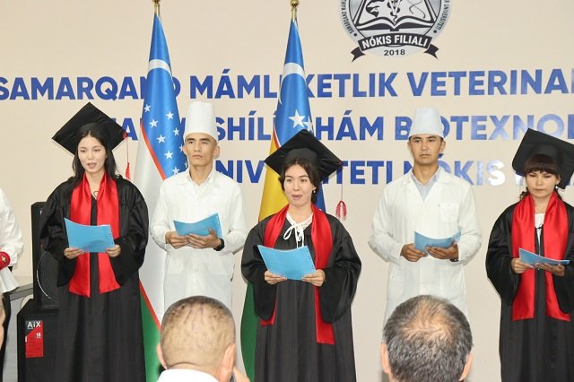 Shundan so‘ng tadbirning kulminatsiya nuqtasi yetib keldi va “Veterinar qasamyodi” marosimi o‘tkazildi. Veterinariya meditsinasi yo‘nalishining bitiruvchi yoshlari tantanali ravishda «Veterinar qasamyodi»ni qabul qilib, o‘z kasbiga sodiq xizmat qilishga va'da berishdi. Mana shunday hayojonli fursatlarda bayram tadbiriga tashrif buyurgan ota-onalar so‘zga chiqib, farzandlariga bilim va tarbiya bergan filial professor-o‘qituvchilariga minnatdorchilik bildirib, barcha bitiruvchilarga oq yo‘l tilashdi.