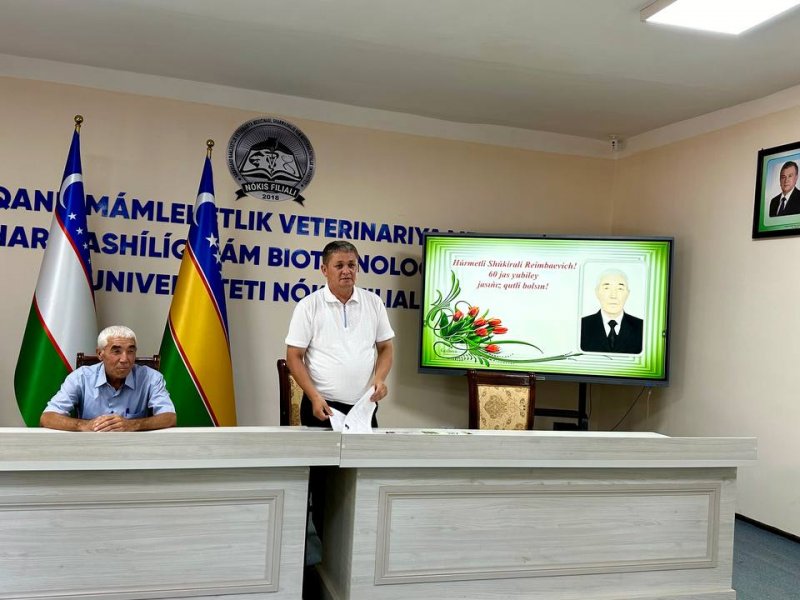 Samarqand davlat veterinariya meditsinasi, chorvachilik va biotexnologiyalar universiteti Nukus filialida bosh auditor lavozimida faoliyat yuritib kelayotgan Izbanov Shukirali Reimbaevichning tabarruk 60 yoshga to‘lishi munosabati bilan tabrik tadbiri bo‘lib o‘tdi. Butun filial jamoasi majlislar zaliga to‘planib, to‘g‘ilgan kun egasiga hurmat bajo keltirishdi. Filial direktori Adilbay Esimbetov so‘zga chiqib, Sh.Izbanovni qutlug‘ 60 yoshi bilan samimiy tabriklab, ezgu tilaklarini bildirib o‘tdi. Shuningdek, qahramonimizning o‘z ishiga bo‘lgan mas'uliyati, mehnatsevar ekanligin alohida ta'kidlab o‘tdi. Shundan so‘ng filial jamoasi to‘g‘ilgan kun egasining manziliga eng ezgu tilaklarini bildirib, unga uzoq umr tilashdi.