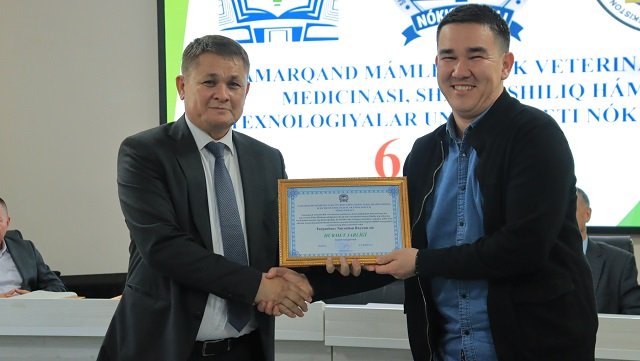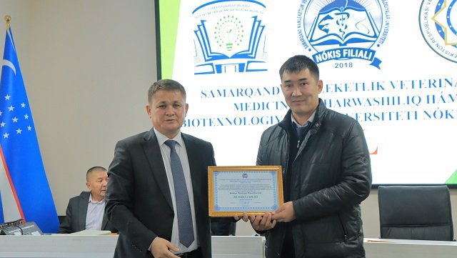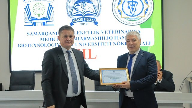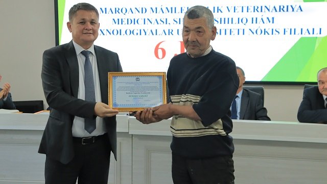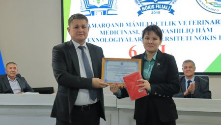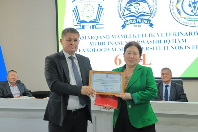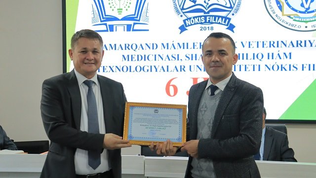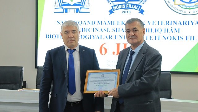 Bugun, 13 –noyabr Samarqand veterinariya meditsinasi instituti Nukus filiali (hozirda Samarqand davlat veterinariya meditsinasi, chorvachilik va biotexnologiyalar universiteti Nukus filiali) tashkil topgan kun . Ushbu sana munosabati bilan oliygohda o‘quv muassasasining 6 yilligi nishonlandi. Tadbir boshida filial direktori, professor A.Esimbetov so‘z olib, filial tarixi, tashkil etilganidan to bugungi kunga qadar erishgan va erishib kelayotgan yutuqlari, mashaqat va qilingan mehnatlar haqida to‘xtaldi. Yig‘ilganlarni filial tashkil etilganligiga 6 yil to‘lishi munosabati bilan samimiy tadbikladi. Shundan so‘ng O‘zbekiston Respublikasi Veterinariya va chorvachilikni rivojlantirish qo‘mitasi Fan va ta'lim sohasini rivojlantirish boshqarmasi boshlig‘i o‘rinbosari, veterinariya fanlari doktori, professor S.Mavlonov, Qoraqalpog‘iston Respublikasi veterinariya va chorvachilikni rivojlantirish qo‘mitasining Nukus shahar bo‘limi boshlig‘i Q.Pirnazarov, direktor o‘rinbosarlari so‘zga chiqib, ushbu sana bilan barchani chin dildan qutlab, o‘zlarining ezgu tilaklarini bildirishdi. Bugungi kunda davlatimiz tomonidan veterinariya va chorvachilik sohasiga qaratilayotgan alohida e'tibor va amalga oshirilayotgan yirik loyihalarga alohida urg‘u berib o‘tildi.