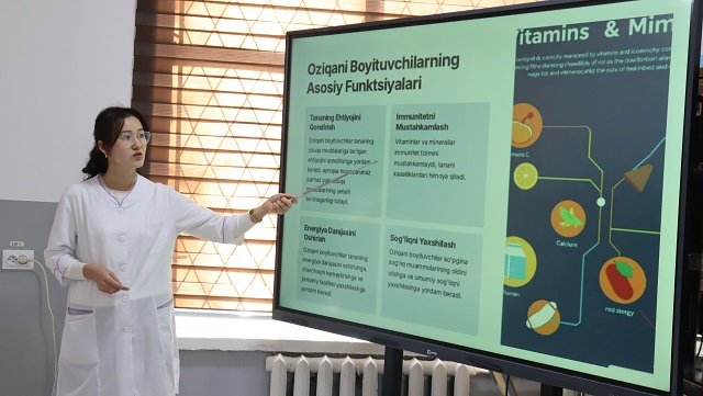 Olib borilgan to‘garak davomida talabalarga oziq-ovqatni boyitishning turli usullari, uning samaradorligi va organizmga bo‘lgan ta'siri haqida ham ma'lumotlar berildi. Asosan vitaminlar, minerallar va kompleks boyituvchilar haqida ko‘proq ma'lumotldar berildi. Vitaminlar va minerallar odam organizmi uchun muhim rol o‘ynashi, vitaminlar turli xil bioximik jarayonlarda ishtirok etib, organizmning barqaror ishlashini ta'minlashi, minerallar esa, suyaklar va tishlarning sog‘lom bo‘lishi, qon hajmining normal holda bo‘lishi va turli biologik reaksiyalarning amalga oshishida muhim ekanligi ta'kidlab o‘tildi.