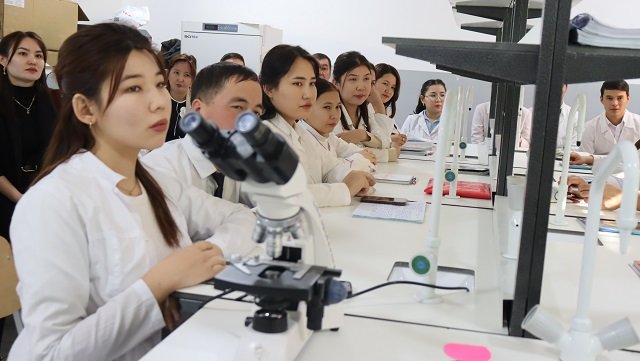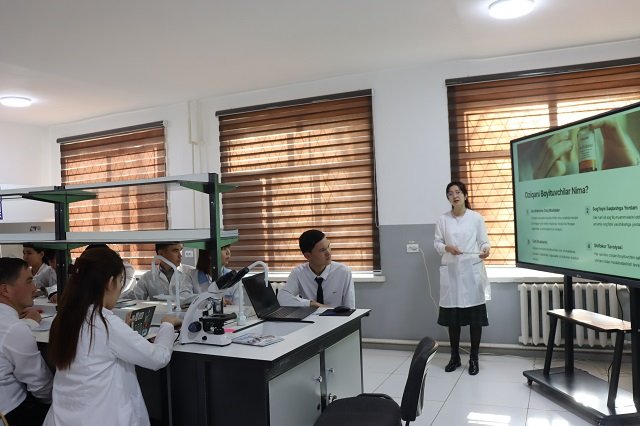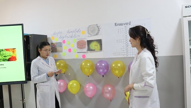 B.Muratbayeva tomonidan o‘tkazilgan dars interaktiv usulda tashkil etildi. Shuningdek, dars davomida talabalar oziq-ovqat mahsuloti bo‘lgan guruchni mikroskop orqali tekshirib ko‘rishdi. Bu amaliy mashg‘ulot orqali ular mikroskopdan foydalanish va oziq-ovqat mahsulotlarining strukturasini aniqlash bo‘yicha ko‘nikmalarga ega bo‘lishdi. Talabalarning nazariy bilimlarini amaliy tekshirish va laboratoriya shart-sharoitlarida ishlash qobiliyatlari mustahkamlandi. Dars davomida talabalar turli savollarga javob berish, qiziqarli o‘yinlarda qatnashish va o‘zaro fikr almashish orqali bilimlarini mustahkamladilar. Bu mashg‘ulotlar talabalarning tahlil qilish, o‘zlashtirish va amaliyotda qo‘llash qobiliyatlarini yanada rivojlantirishga yordam berdi.
