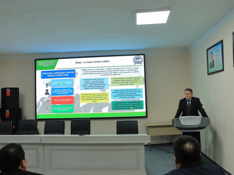 Joriy yilning 8-yanvar kuni filial direktori A. Esimbetov boshchiligida, filialda 2025-yilda amalga oshirilishi rejalashtirilgan ishlar bo‘yicha ochiq muloqot o‘tkazildi. Tadbirda direktor o‘rinbosarlari, professor-o‘qituvchilar va barcha bo‘lim xodimlari ishtirok etdi. Muloqotda joriy 2025-yilda belgilab olingan yangi maqsadlar va vazifalar muhokama qilindi, o‘qituvchilarning ilmiy va pedagogik faoliyatini yanada takomillashtirish masalalari alohida e’tibor qaratildi.Ochiq muloqot davomida 2025-yilda ilmiy salohiyatni oshirish bo‘yicha amalga oshirilishi lozim bo‘lgan ishlar keng muhokama qilindi. Filialda ilmiy tadqiqotlar va innovatsion loyihalarni rivojlantirish, professor-o‘qituvchilarni ilmiy izlanishlarga keng jalb qilish va ilmiy darajalarga ega bo‘lishlariga yordam berish masalalari ustuvor vazifalar sifatida belgilandi. O‘qituvchilarni ilmiy ishlarga faol jalb qilish, zamonaviy ilmiy metodlarni joriy etish va ilmiy tadqiqotlar uchun zarur sharoitlarni yaratish uchun aniq yo‘nalishlar belgilandi. Filialda ilmiy va pedagogik faoliyatning integratsiyasini kuchaytirish, yangi ilmiy metodologiyalarni rivojlantirishga qaratilgan ishlar alohida ta’kidlandi. Tadbirda o‘qituvchilarning ilmiy va pedagogik faoliyatini yanada rivojlantirish bo‘yicha rejalashtirilgan chora-tadbirlar ham keng muhokama qilindi. O‘qituvchilarning o‘quv jarayonida samarali metodlar va zamonaviy pedagogik texnologiyalarni qo‘llashga, talabalar bilan ishlashda innovatsion yondashuvlarni tatbiq etishga, ta’lim sifatini oshirishga qaratilgan aniq tavsiyalar berildi. Bundan tashqari, o‘qituvchilarni pedagogik sohada o‘z bilim va ko‘nikmalarini rivojlantirish uchun zarur sharoitlar yaratish, o‘quv jarayonini yuqori darajada tashkil etish ham asosiy vazifalardan biri sifatida belgilandi. Filialdagi o‘quv jarayonining samaradorligini oshirish bo‘yicha ham bir qator muhim vazifalar belgilandi. O‘quv rejalari va dasturlarini takomillashtirish, ilmiy tadqiqotlar va o‘quv jarayonida integratsiyani kuchaytirish, shuningdek, yangi metodologiyalarni joriy etish uchun kerakli chora-tadbirlar ishlab chiqildi. Professor-o‘qituvchilarning yangi bilimlarni o‘zlashtirishlari, amaliy ko‘nikmalarini oshirishlari uchun zarur infratuzilma va sharoitlar yaratish masalasiga alohida e’tibor qaratildi. Ochiq muloqot davomida xalqaro miqyosda anjumanlar va ilmiy konferensiyalarni tashkil etish masalasiga alohida e’tibor qaratildi. Filialning xalqaro aloqalarini mustahkamlash, xorijiy ilmiy muassasalar bilan hamkorlikni kengaytirish va ilmiy-texnik innovatsiyalarni joriy etish bo‘yicha aniq yo‘nalishlar belgilandi. 2025-yilda o‘tkaziladigan xalqaro anjumanlar va konferensiyalar orqali o‘qituvchilar va talabalar uchun yangi ilmiy imkoniyatlar yaratish, ilmiy aloqalarni rivojlantirish, shuningdek, filialning xalqaro nufuzini oshirish maqsadlari ko‘zda tutilmoqda. Bu kabi tadbirlar, nafaqat ilmiy hamkorlikni kuchaytirish, balki o‘quv jarayonining sifatini oshirish, zamonaviy ilmiy yondashuvlarni va metodlarni tadbiq etishga ham xizmat qiladi. Shuningdek olib borilgan muloqotda filialning ma’naviy-ma’rifiy faoliyatini yanada rivojlantirish masalalari ham muhokama qilindi. O‘qituvchilar va talabalar o‘rtasida ma’naviy qadriyatlarni targ‘ib qilish, ularni jamiyatda ijtimoiy mas’uliyatli va huquqiy ongli fuqarolar sifatida tarbiyalashga qaratilgan chora-tadbirlar belgilandi. Talabalarning ma’naviy salohiyatini oshirish uchun turli madaniy tadbirlar, seminarlar va suhbatlar o‘tkazish rejalashtirildi. Muloqotda, shuningdek, filialning moddiy-texnik bazasini mustahkamlash va o‘quv jarayonini samarali tashkil etish uchun zarur infratuzilma yaratish masalalari ham muhokama qilindi. Filialda ta’lim jarayonini yuqori sifatda tashkil etish uchun zamonaviy o‘quv jihozlari, laboratoriyalar va texnologik uskunalar joriy etish zarurligi ta’kidlandi. O‘quv binolarining ta’mirlanishi, zamonaviy kompyuter texnikalari va interaktiv o‘quv materiallari bilan ta’minlash, shuningdek, o‘quvchilar va o‘qituvchilar uchun qulay sharoitlar yaratish bo‘yicha chora-tadbirlar belgilandi. Moddiy-texnik bazaning kuchaytirilishi nafaqat o‘quv jarayonini samarali tashkil etishga, balki ilmiy tadqiqotlar va texnologik innovatsiyalarni rivojlantirishga ham katta hissa qo‘shadi. Ochiq muloqot davomida 2025-yil davomida amalga oshirilishi rejalashtirilgan barcha ishlarga qaratilgan aniq yo‘nalishlar va vazifalar belgilandi. Filialning ilmiy va pedagogik salohiyatini oshirish, xalqaro aloqalarni mustahkamlash, ma’naviy-ma’rifiy ishlarni rivojlantirish, moddiy-texnik bazani kuchaytirish kabi muhim masalalar, kelgusi yilga qadar amalga oshirilishi zarur bo‘lgan vazifalar sifatida ajratildi. Muloqotda barcha ishtirokchilar o‘z bilim va tajribalarini safarbar etish, belgilangan maqsadlarga erishish yo‘lida birgalikda ishlashga tayyor ekanliklarini bildirdilar. Ushbu ochiq muloqot, 2025-yilda amalga oshirilishi rejalashtirilgan barcha chora-tadbirlar va maqsadlarni belgilab berishda muhim qadam bo‘ldi. Bu, shuningdek, filialning kelajakdagi rivojlanish strategiyasini shakllantirish va ta’lim sifatini yanada oshirish uchun zarur asosni yaratdi.
