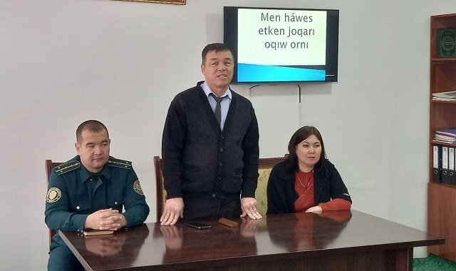 Tadbirni «Veterinariya va zooinjeneriya fakultetining Yoshlar bilan ishlash, ma’naviyat va ma’rifat ishlari bo‘yicha dekan o‘rinbosari E.Seytmuratov boshqarib, o‘quvchilarga oliy o‘quv yurtlarida o‘qish imkoniyatlari haqida batafsil ma’lumotlar berdi. Suhbat davomida E.Seytmuratov yoshlarning oliy ta’lim olishga qiziqishlarini yanada oshirish, o‘z maqsadlariga erishish yo‘lida motivatsiya berish hamda oliygohlarning imkoniyatlaridan to‘liq foydalanishning ahamiyatini ta'kidladi.