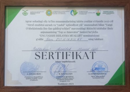 4-bosqich talabasi A.Baltabayev “Eng yaxshi ishlanma muallifi” nominatsiyasi bo‘yicha sertifikat bilan taqdirlandi. Iqtidorli talabamizning loyihasi e'tirof etildi.