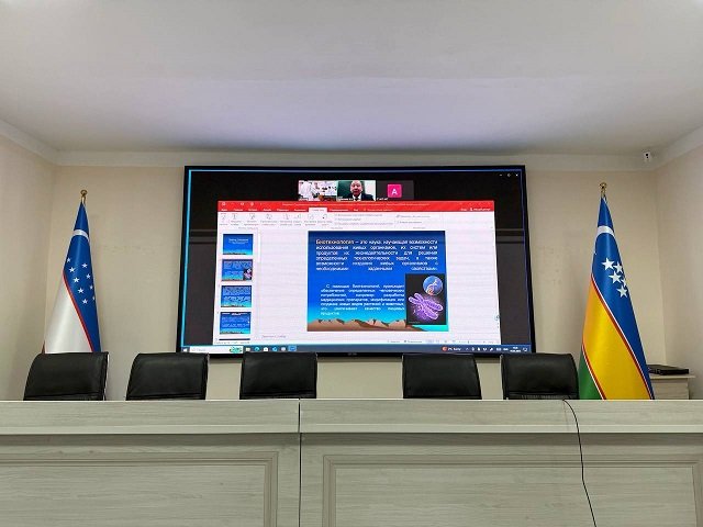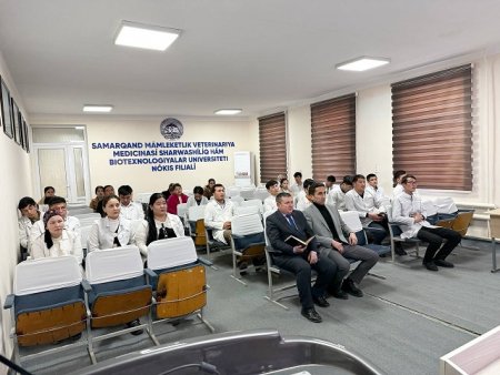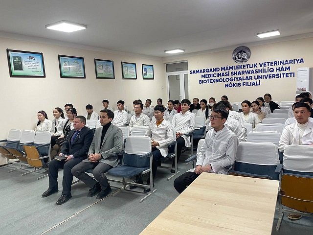 Samarqand davlat veterinariya meditsinasi, chorvachilik va biotexnologiyalar universiteti Nukus filiali "Zooinjeneriya" kafedrasi bitiruvchi kurs talabalariga Qozog‘iston milliy agrar tadqiqot universiteti "Zooinjeneriya va biotexnologiya" kafedrasi professori, shuningdek, Qozog‘iston Respublikasi Fanlar akademiyasi akademigi Buralxiev Batirxan Azimxanovich tomonidan «Chorvachilikda biotexnologiyaning zamonaviy usullari» mavzusida online ma'ruza o‘tkazildi.