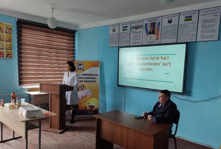 Shuningdek, dars davomida sut ko‘rgazmasi tashkil etildi, bu esa talabalar va yoshlarning sutchilik sohasiga bo‘lgan qiziqishini yanada oshirdi. Ko‘rgazmada turli xil sut mahsulotlari namoyish etilib, talaba-yoshlar o‘z taqdimotlarini amalga oshirdilar. Taqdimotlar davomida yoshlar sutchilik sohasida amalga oshirilayotgan innovatsiyalar, yangi texnologiyalar va ishlab chiqarish samaradorligini oshirish bo‘yicha fikrlarini bildirgan holda, shu sohaga bo‘lgan qiziqishlarini namoyish etdilar.