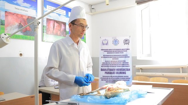Samarqand davlat veterinariya meditsinasi, chorvachilik va biotexnologiyalar universiteti Nukus filialida tayanch doktorantlarning ilmiy izlanishlarini qo‘llab-quvvatlash va ularning ilmiy salohiyatini keng ommaga taqdim etish maqsadida navbatdagi ilmiy aprobatsiya bo‘lib o‘tdi. Unda Veterinariya meditsinasi va farmakologiyasi kafedrasining “Hayvonlar patologiyasi, onkologiyasi va morfologiyasi. Veterinar akusherligi va hayvonlar reproduktsiyasi biotexnikasi” ixtisosligi bo‘yicha birinchi bosqichda tahsil olayotgan tayanch doktorant N.Dauletbaev o‘z ilmiy izlanish natijalarini taqdim etdi. Ilmiy ish “Kurkalar orqa oyoq muskullarining chiziqli o‘lchamlari va og‘irliklarini o‘lchash hamda matematik ishlovdan o‘tkazish” mavzusiga bag‘ishlangan bo‘lib, aprobatsiya davomida yosh tadqiqotchi kurkalarning tana tuzilishi, harakat mexanizmi va mushak massasining skeletga nisbati kabi muhim morfologik xususiyatlarini ilmiy asosda yoritib berdi. Ta’kidlanishicha, kurkalarda mushak massasining skelet massasiga nisbati 2,2–2,4:1 ni tashkil qiladi va bu ko‘rsatkich ularning harakat funksiyasi, ayniqsa orqa oyoqlarning biomekanik ahamiyatini aniqlashda muhim mezon hisoblanadi.