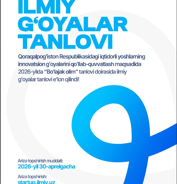 Bo‘lajak olim” tanlovi doirasida Qoraqalpogʻiston Respublikasidagi iqtidorli yoshlarning innovatsion gʻoyalarini qoʻllab-quvvatlash maqsadida 2026-yilda ilmiy g‘oyalar tanlovi bo‘yicha arizalar qabuli boshlandi
