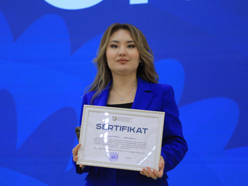 Haftalik yakunida barcha faol ishtirokchilarga tashkilotchilar tomonidan sertifikatlar topshirildi. Shu jumladan, Z.Xojamuratova ham o‘z faol ishtiroki va kasbiy yondashuvi uchun taqdirlandi.